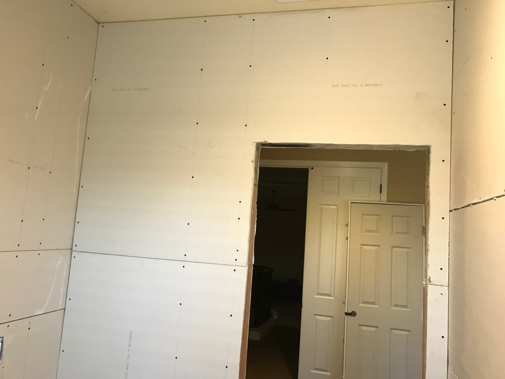 Next up was adding the last bit of insulation into the door wall side of things. I got the insulation estimate just about right, ending with just a little bit extra. Once that insulation was in place, I finished installing the drywall on the outside, and then finally the inside of the door wall. Here I again did the same process, where I installed the full piece, and then went back and cut the doorway open with the multi-tool. At this point the drywall was all installed, and boy was that an achievement!