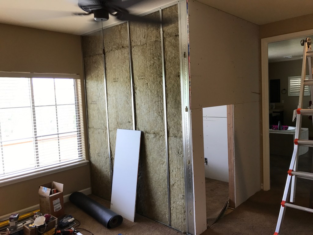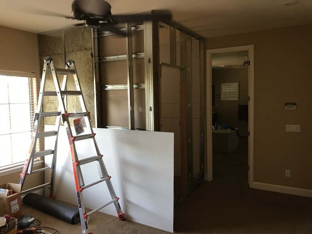 Finally to complete the framing I attached WhisperClips [link here] to the longer, non-door wall along with hat channel to further disperse sound vibrations. Along those lines I also applied sound putty around the ethernet and light and electrical outlets in the open wall to further cut-off any sound from those openings. All of these extra steps took time and money, and more importantly added a TON more complexity to the project, especially in the case of measuring and cutting. Was it worth it, I hope so, as it was definitely a lot of work, but perhaps some of it was overkill, although when the kids come home from school I am still able to work fairly uninterrupted with the door closed. With the metal skeleton now complete, it was time to get to the real work. I should add here that my wife was a trooper with our room being a construction zone with every possible tool and scrap laying all around the room for months. The build timeline from this picture above until I moved my desk into it was a solid 3 months. I had a lot of work travel and other things that interrupted my build time, but it was a fun project to see consistent, albeit somewhat slow, progress on.