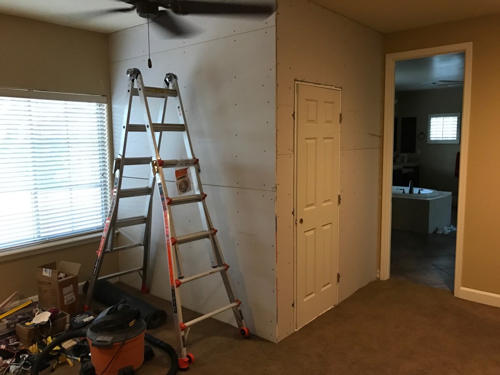I then went on to installing the insulation in the big outside wall, as well as apply the drywall to the door-side. I first applied the top sheet across the doorway, then later I came back and used my super-star tool from this entire build, my multi-tool [LINK HERE]. This thing seriously saved me probably 50x or more during the process of this build. It is loud and made my hand hurt from all the vibrating, but I couldn’t have finished without this thing, serious MVP! My wife followed right under me with the shop-vac so we didn’t make drywall dust completely cover everything in the room.