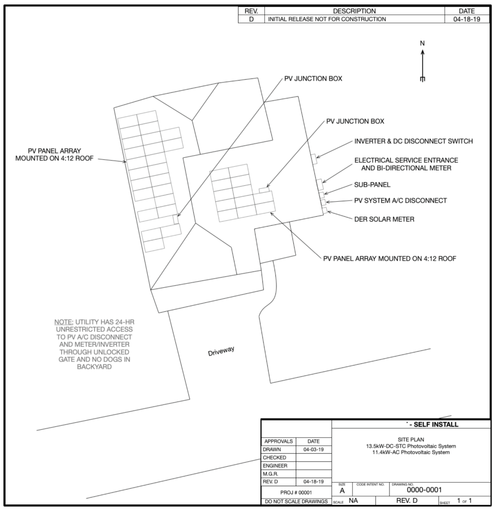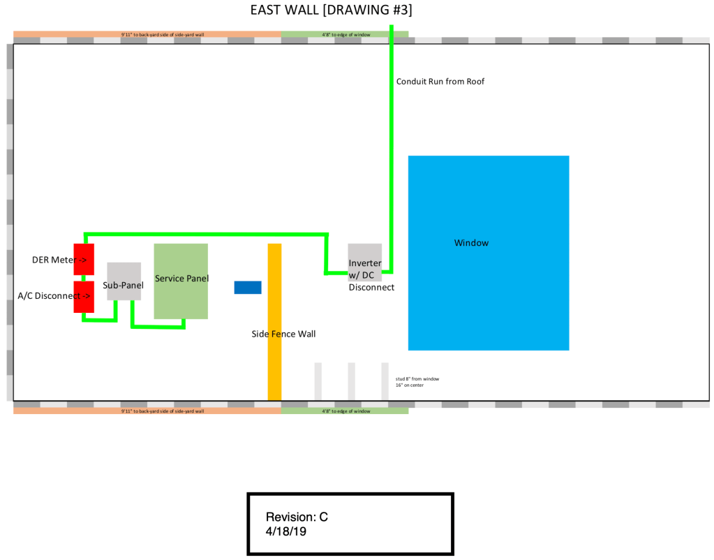 For the utility sign-off and the permit process, you are required to submit a site plan and I also included more detailed, scale drawings I made in Excel to help me assess where everything was going to go. For the excel files, I made them to scale with each cell being 3″ in real life. So it is a spreadsheet with a TON of rows and columns of small squares in which I drew the layout in. These plans were immensely useful, and were the plans I actually did the install by.