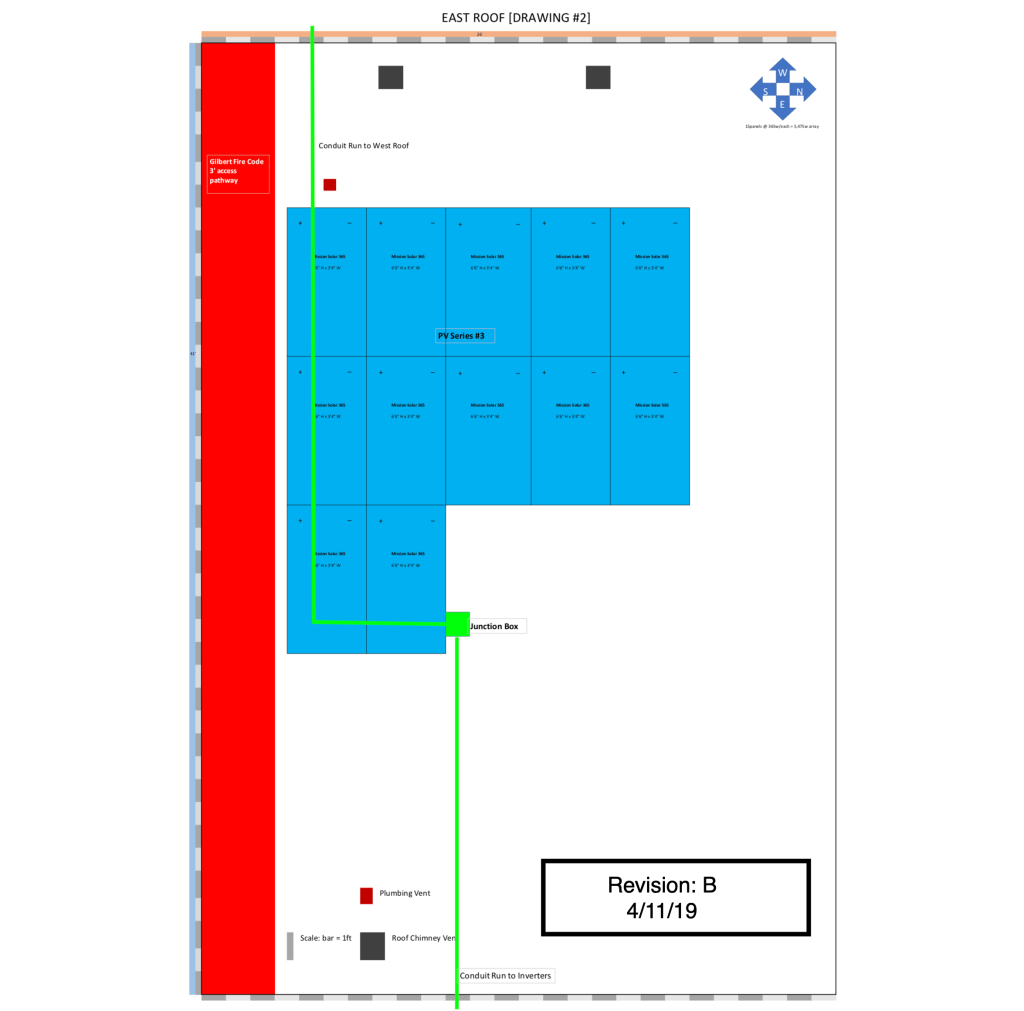 In my research I came across Wholesale Solar and decided I would purchase my grid-tied complete package from there. So once the new plans were voted in, I ordered the electrical diagram part of the package I was purchasing that same day. I then began working on the city permit and structural engineer sign-off on the roof. In the end I decided to do 36 x 72-cell panels (375w/panel) for a total of a 13.5kW solar array with a single 11.4kW Solar Edge inverter.