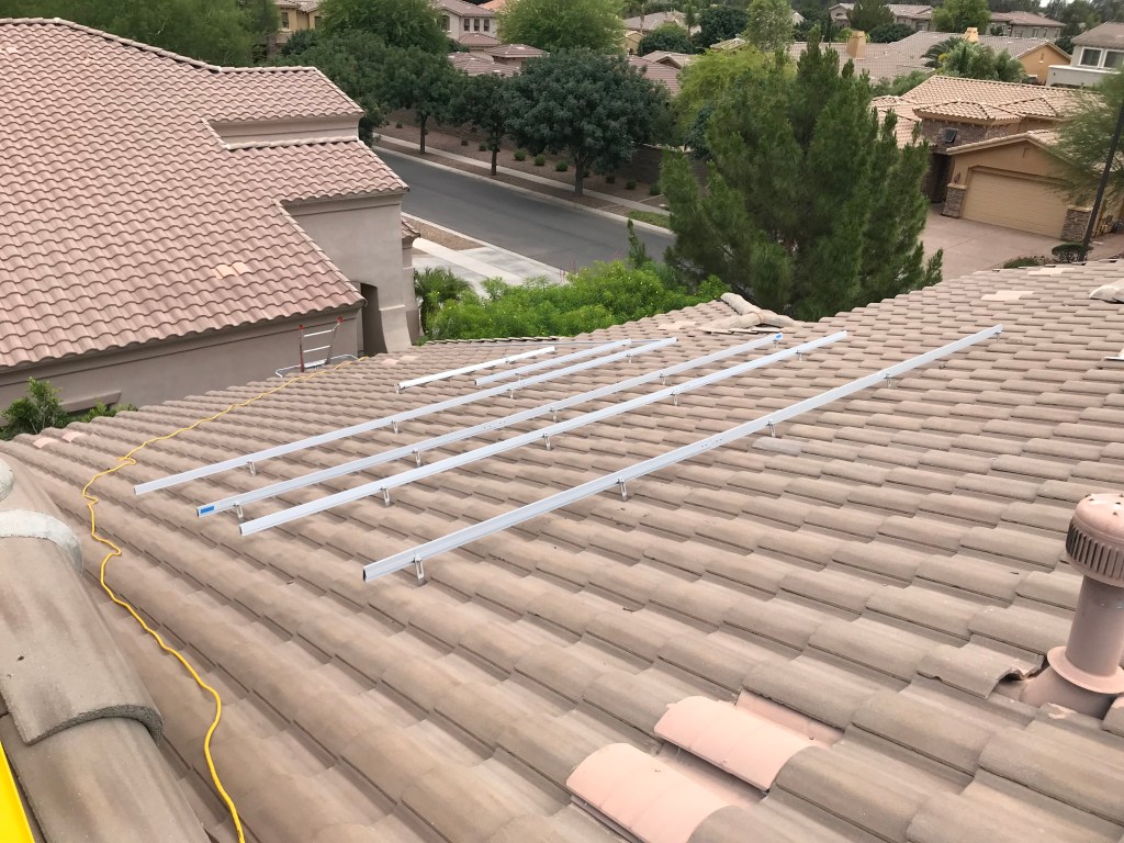 So I then had to call an audible and change the plan for the West roof to use the Iron Ridge Knock Out product of mount points. Instead of installing the mount and then replacing the tile, you completely replace the tile with a custom flashing, and then install a special mount with a single bolt on the underside, and then the actual mount arm is attached to a bolt punched through the flashing. The result is a much easier installation, but it cost nearly $1,000 to get these 45 new mounts and flashing that was I not planning on. Further I was not as thrilled that the KO mounts were 1-2″ closer to the roof than the other mounts were. But as they say, beggars can’t be choosers, and I didn’t have any other options.