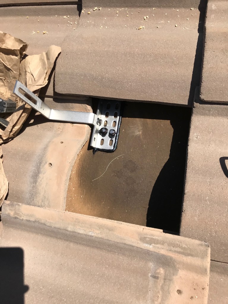 Upon completing the East side, I moved over to the west side, and quickly found out that the tile mounts would not line up with the valleys as they are supposed to. They have a bunch of holes and the arm can move to one extreme side or the other, but it still wasn’t enough to accommodate my tiles, for whatever reason. I had many people tell me they have never seen it, but I tried it every way I could think of and simply did not reach the valley.